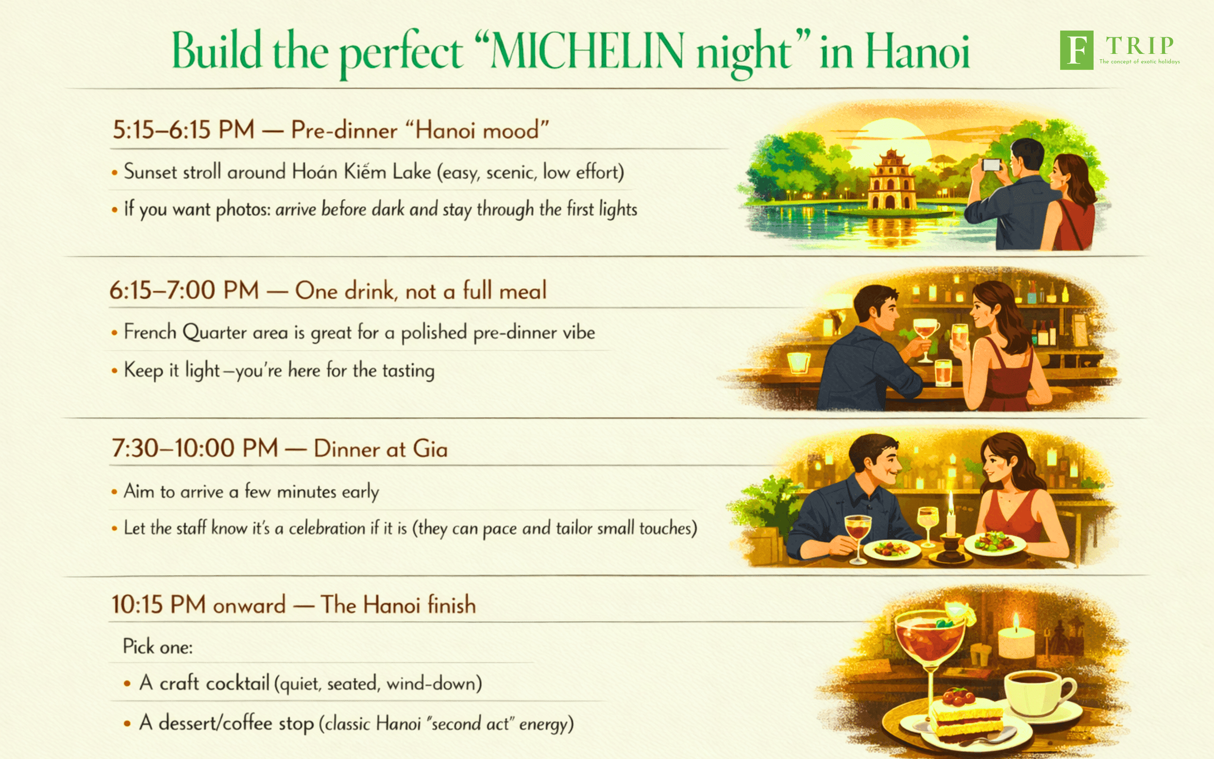 - Fine-dining itinerary design: pair your Starred dinner with a Hoàn Kiếm walk, a cocktail stop, or a next-day street-food tour.