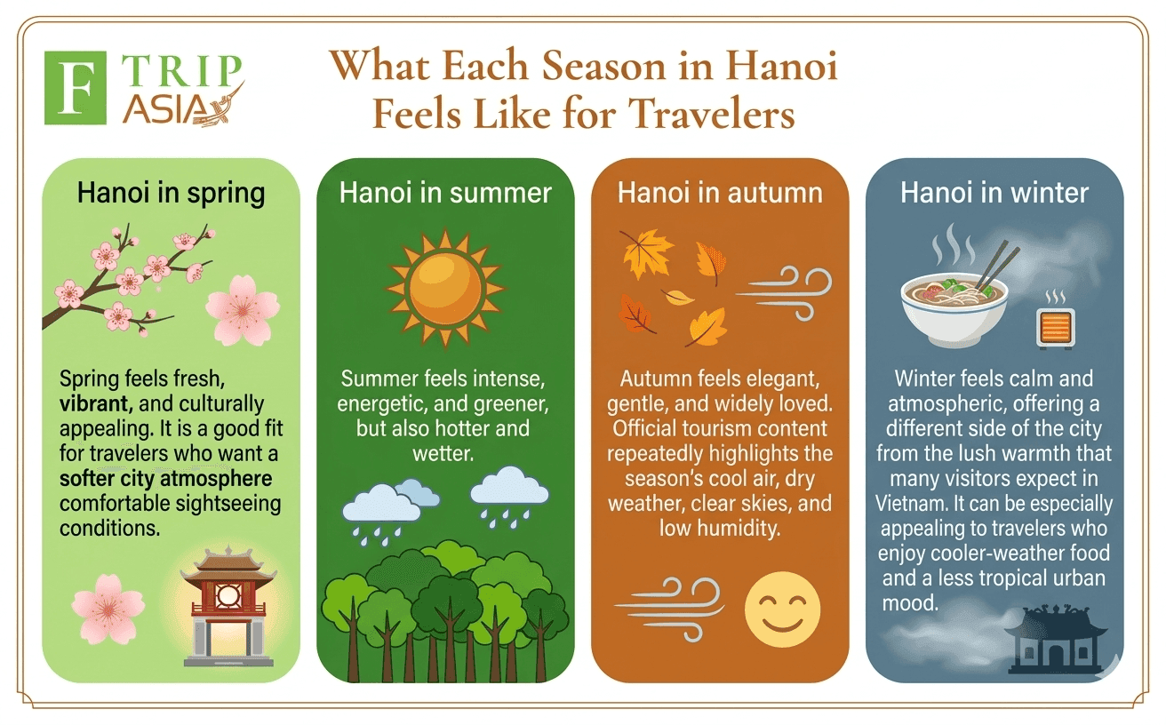 Hanoi’s seasons matter because they can significantly affect walking comfort, food tours, cultural sightseeing, and outdoor experiences. A route that feels easy and elegant in autumn can feel much more humid and tiring in midsummer. This is one reason Hanoi should not be planned the same way as southern Vietnam, where seasonal patterns are different.