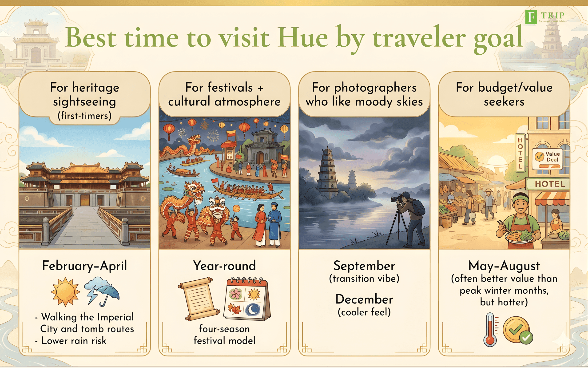 If you’re coming specifically for cultural programming, Hue’s four-season festival model makes it possible to plan around events throughout the year. But if you want the smoothest, lowest-stress trip, avoid locking your core outdoor heritage days into October–November, when heavy rain can seriously affect Central Vietnam travel plans.