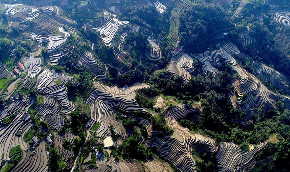 Terrain: Winding mountain passes, terraced rice fields, misty valleys, and ancient limestone formations.