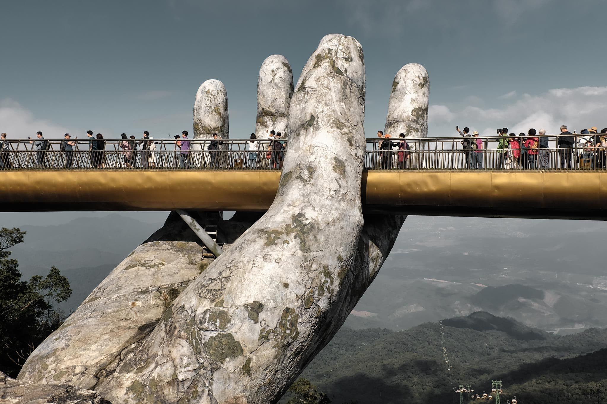 The Golden Bridge is arguably one of the most famous features of the Ba Na Hills entertainment and resort complex in Da Nang. Two moss-wreathed stone hands (actually made out of fiberglass and wire mesh) rise out of the hillside to lift up a shining bridge, from which visitors can enjoy a stunning bird’s eye view of the region.
