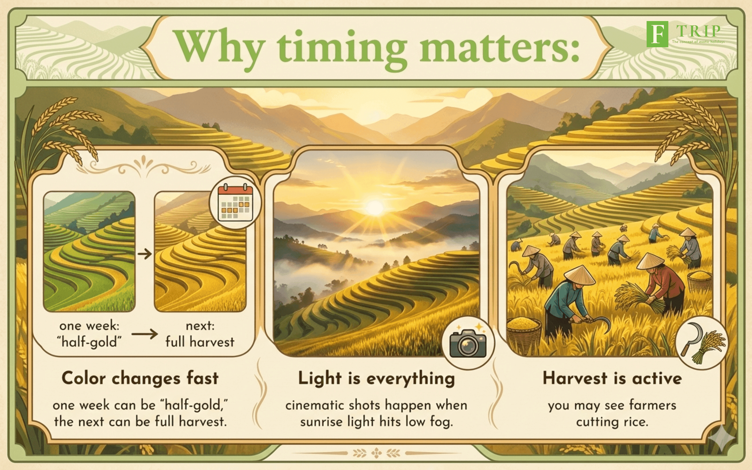 “Golden season” is the short period right before harvest, when ripening rice turns terraces from green into luminous gold. In terrace regions, that window can be brief—often 1–3 weeks depending on rainfall, temperature, and elevation differences between villages.